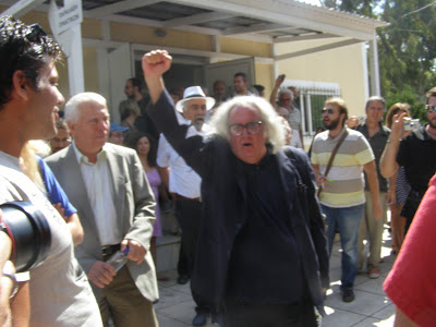 Savas Michael-Matsas saluting supporters after he was acquitted of charges brought by the fascist Golden Dawn