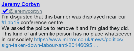 “I’m disgusted that this banner was displayed near our #Lab19 conference centre. We asked the police to remove it and I’m glad they did. This kind of antisemitic poison has no place whatsoever in our society.”
