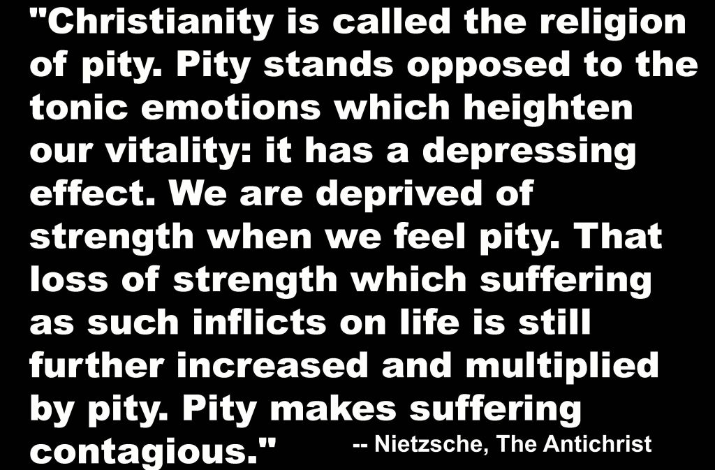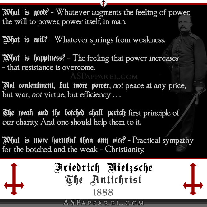 This is Friedrich Nietzsche in The Antichrist. Its ‘God is dead’ opposition to Christian charity and attraction for far rightists and fascists are obvious: