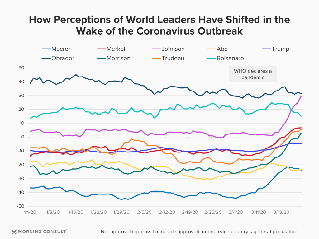 Italy’s prime minister Giuseppe Conte has surged 27 points in one poll in a global national war effort mentality and France’s Macron is up 15%. Boris Johnson is riding high in the polls and Trump has just had a flip to move within 2 points of Biden, 49% to 47%, according to jus ton poll. But the poll of polls still gives Biden a 6 point lead. But Trump’s modest rise in this war situation. Old George Bush hit 90% in the Gulf War. As Simon Tisdall tells us in the Guardian when asked if the country is heading in the right direction the answer is no by 55% to 38%. When the nasty stuff hits the fan Trump’s approval rates will plummet, along with many other right populists globally.