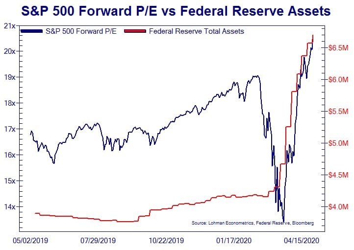 As a result, the US stock market’s valuation against future corporate earnings has rocketed up in line with the Fed injections. If the Fed will buy any bond or financial instrument you hold, how can you go wrong?