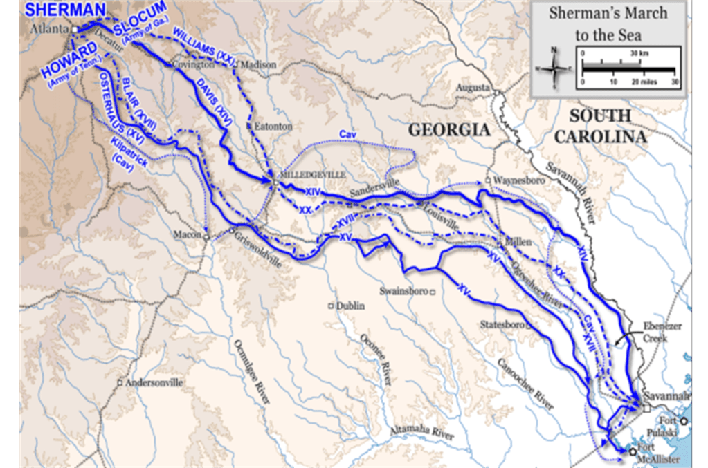 Sherman’s 1864 march from Atlanta to the sea was a 90-mile wide scorched earth. Often not a living thing survived; crops and livestock were seized or destroyed. Farmers shacks were burned, railroads ripped up in the first example in modern times of total war. Although slaves were freed, there was no revolutionary appeal to joint the crusade for human liberation. The Ku Klux Klan were lynching and slaughtering blacks within two years.