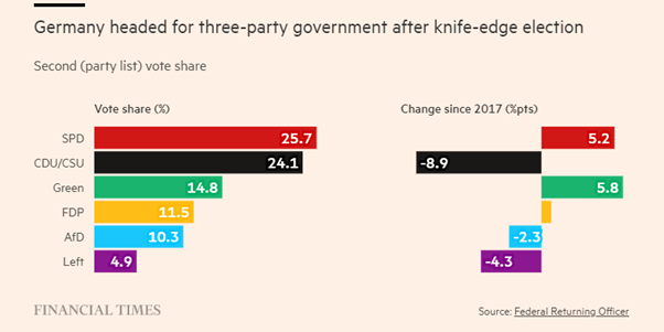 The result of German Federal election was almost exactly as the opinion polls predicted. The Social Democrats (SPD) got the largest share of those voting (25.7%), up 5.2% pts from the 2017 disaster. The Christian Democratic and Christian Social Union (CDU-CSU) vote share slumped to 24.1%, its lowest vote share since it was formed. The Greens polled 14.8%, less than previous polls forecast, but still the best result ever for them (up 5.8% pts). The small business, free market Free Democrats (FDP) took 11.5% (up slightly from 2017).